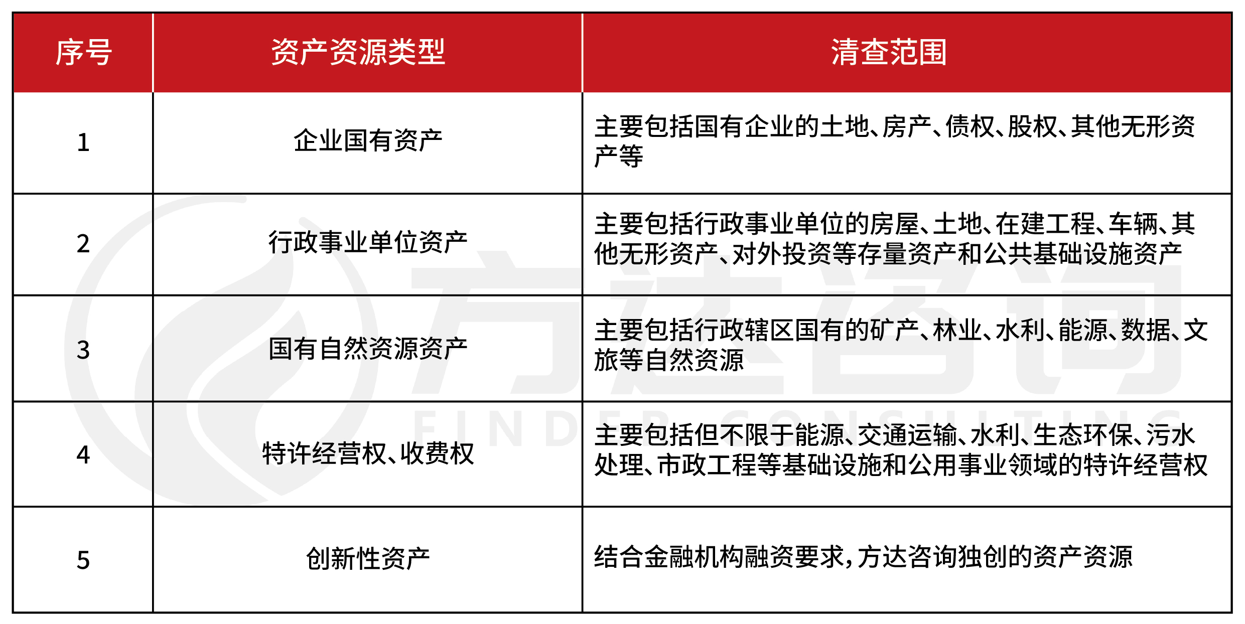 方达咨询结合多年实操经验,建议将“4+1”类国有资产资源作为清查盘活重点,具体涵盖企业国有资产、行政事业单位资产、国有自然资源资产、特许经营权和收费权以及创新性资产。