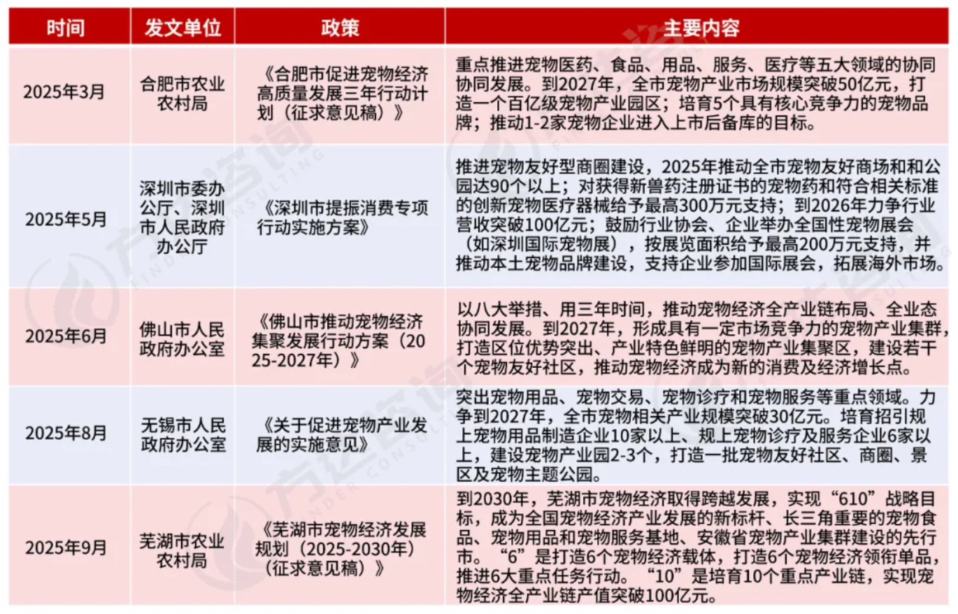 政策机遇空前良好,为宠物产业高质量发展注入强劲动力。近年来,从国家部委到地方政府层面持续释放政策红利,多项支持性与规范性措施陆续出台,推动行业走向标准化、专业化。在行业规范方面,中国兽医协会制定《宠物医院分级评价标准》,上海市出台《宠物殡葬服务规范》,填补多项服务空白,2025年月,农业农村部发布《宠物饲料管理办法》,强化宠物食品生产与标签管理;深圳、成都等地试点将宠物医疗纳入医保支付范围,显著提升宠物医疗保障能力与服务水平,为产业规范发展筑牢制度基础。在地方实践方面,多地通过政策扶持,明确区域产业发展重点和具体产业赛道,积极布局宠物经济并作为城市产业升级和新质生产力培育的发力点,有力推动区域宠物产业实现“从无到有、从小到大”的集群发展。