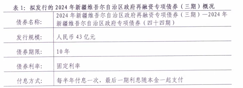 其中,2024年新疆维吾尔自治区政府再融资一般债券(三期)-2024年新疆维吾尔自治区政府一般债券(十四期)、2024年新疆维吾尔自治区政府再融资专项债券(三期)-2024年新疆维吾尔自治区政府专项债券(四十四期)为特殊再融资债券,金额合计90亿元,募集资金用于偿还存量债务。