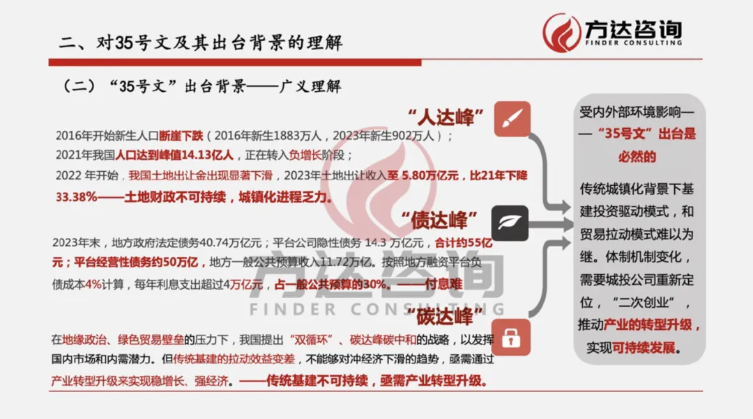 在我看来,35号文不仅仅是一纸政策调整文件,更是时代的新要求,标志着投融资政策环境的根本性变化,需要去分析其发布的背景和必然性。