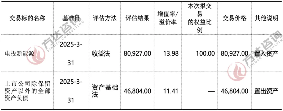 对于置入资产,电投新能源作为运营稳定的新能源企业,未来收益可预测性较强,收益法能够更好地体现其长期价值创造能力,与资本市场对新能源企业的估值逻辑一致。