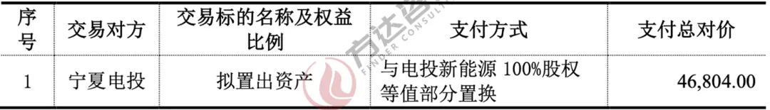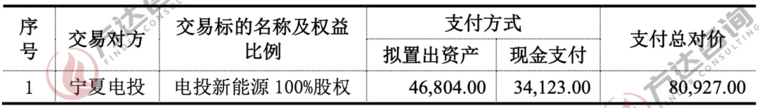 二是支付现金购买资产。本次交易置入资产与置出资产的差额部分,由宝塔实业以现金方式向宁夏电投购买。根据评估,置入资产电投新能源100%股权评估值为80,927.00万元,置出资产评估值为46,804.00万元,差额34,123.00万元由宝塔实业在置入资产交割日起12个月内以现金支付。